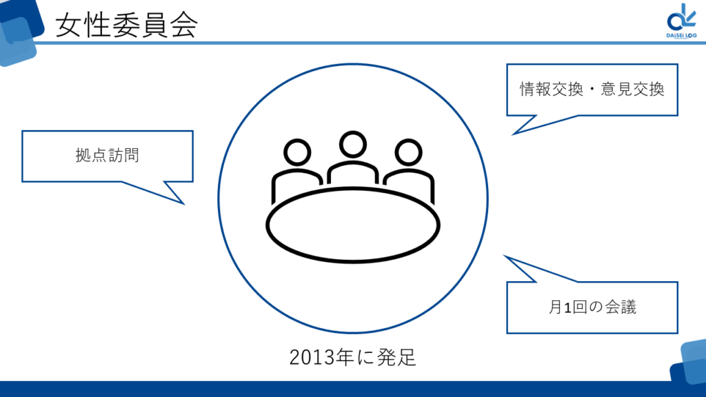 女性委員会では、「女性が働きやすい職場をつくること」を目的に、月1回の会議を実施。