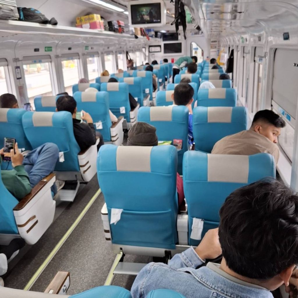 車内はこんな感じ。今回はエグゼクティブなんとかっていうお高めの席を利用させていただきました。片道5千円ぐらい。コンセントもあって、余裕を持って仕事できます。
